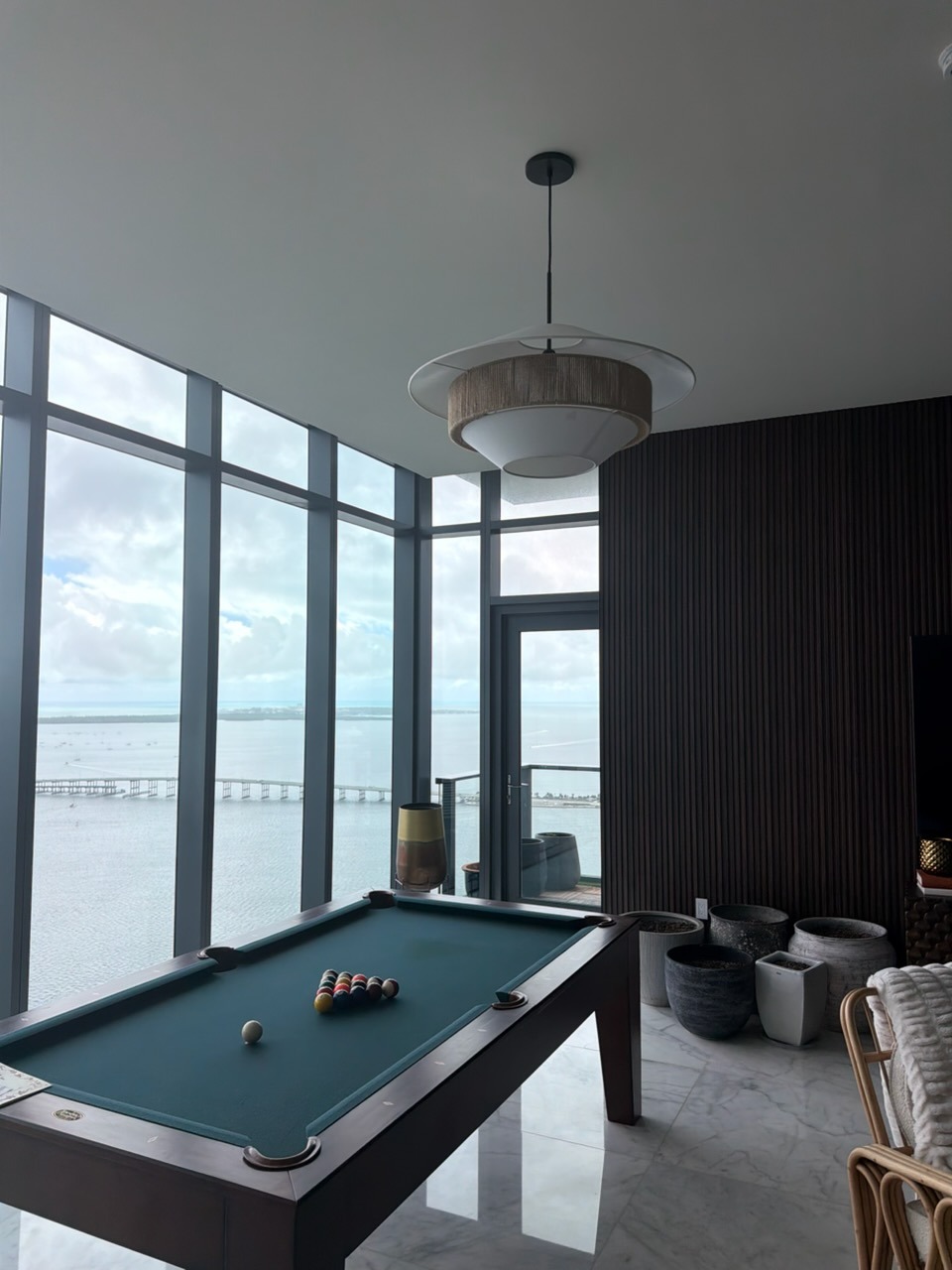 - The ceiling junction box was inspected and reinforced to ensure it could safely support the weight of the new tiered fixture. Performed safe electrical connections, including proper grounding and securing of all wire leads to the residential power supply.The suspension cable was adjusted to a specific drop length, ensuring the fixture remains at an optimal height for the pool table area while maintaining clearance for the panoramic view.The matte black ceiling canopy was mounted flush against the ceiling for a clean, professional aesthetic. Carefully assembled the woven outer shade and the inner frosted glass diffuser to ensure even light distribution without shadows.