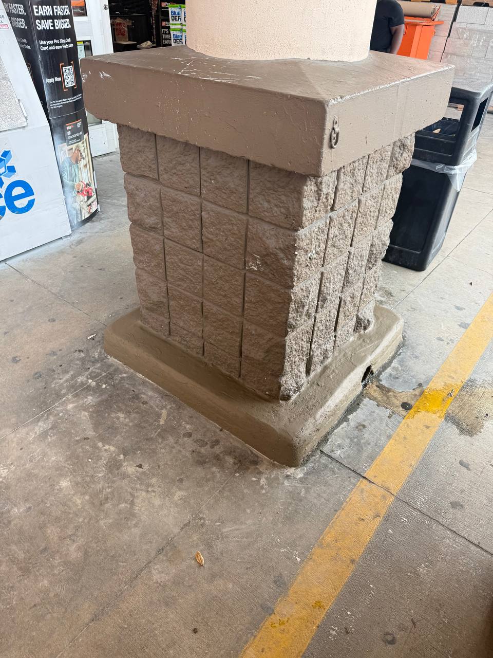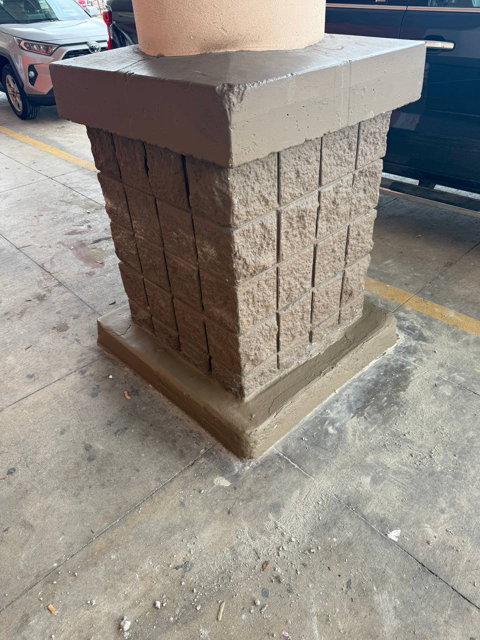 The area around the base of the stone-textured column was cleared of loose debris and old, cracked masonry. A new concrete “skirt” or footer was applied around the entire perimeter of the base. This new layer was hand-troweled to create a smooth, beveled edge that directs water away from the column. The repair reinforces the bottom of the column, protecting the decorative blockwork from impact and environmental wear.