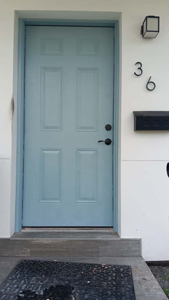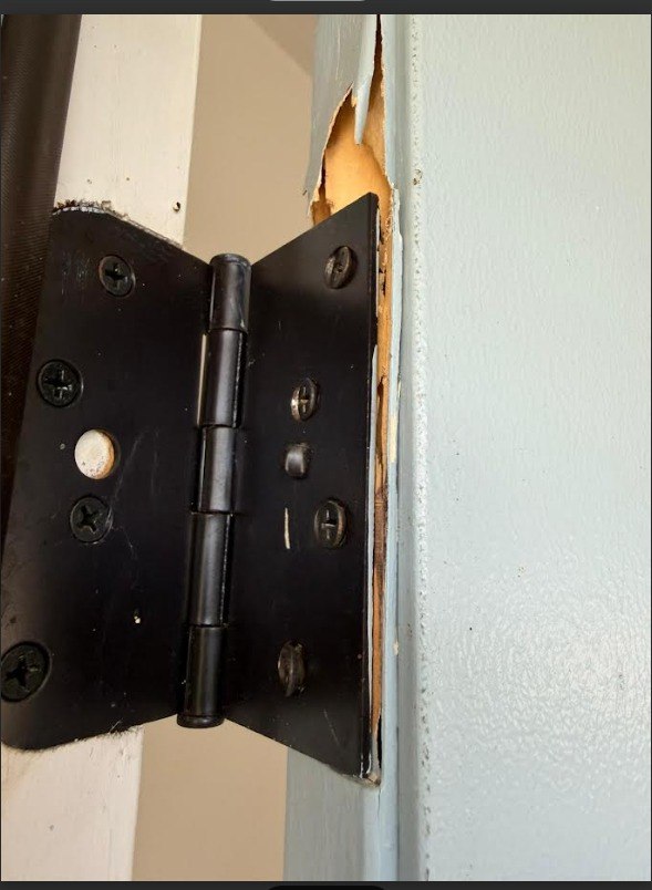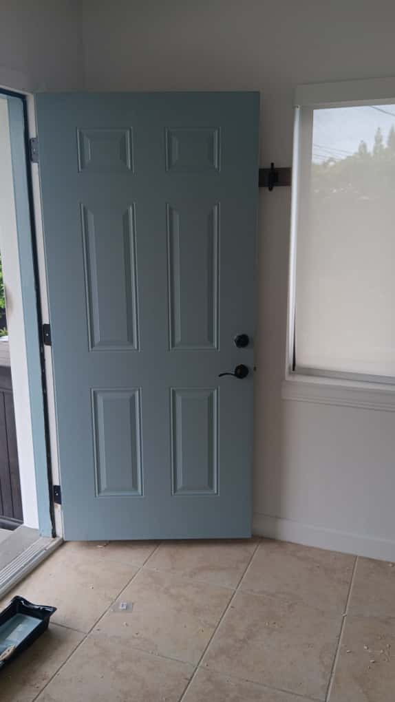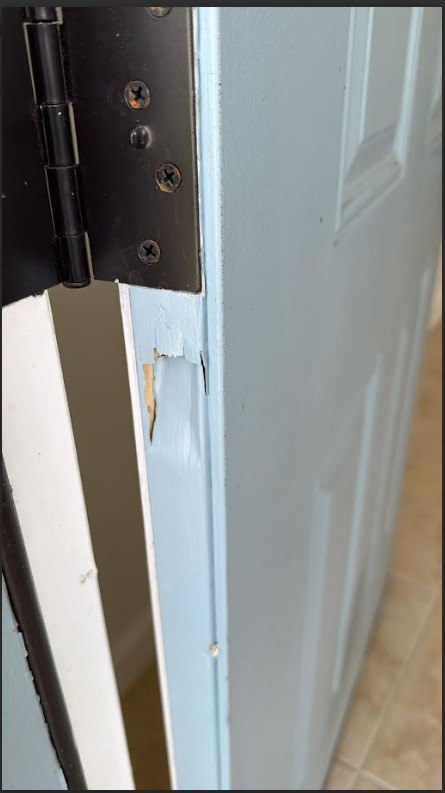 The new door unit was carefully set into the opening, centered, and secured in place using shims on the hinge side. Shims were strategically placed to ensure the door was perfectly plumb and square within the opening. he hinge-side of the door jamb was securely fastened to the wall studs through the shims.
