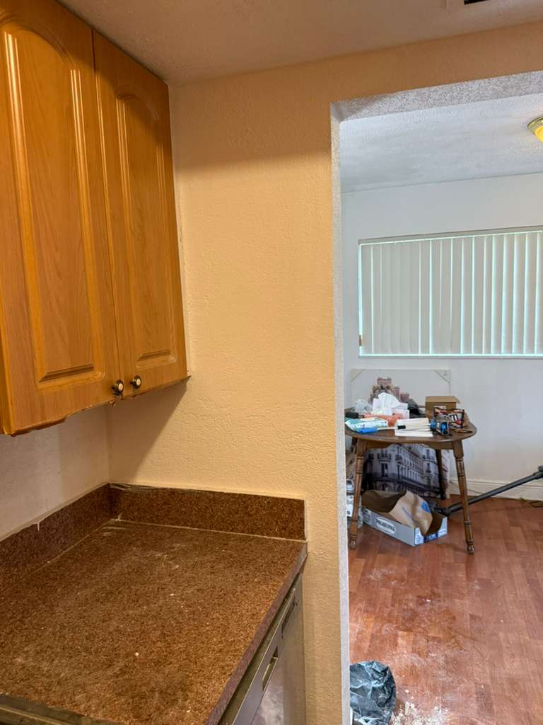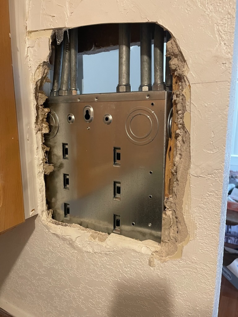 This job involved the repair of the drywall opening around a newly installed electrical panel (breaker box), followed by the application of matching wall texture.