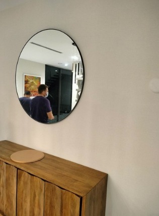 The chosen mounting system was carefully installed on the wall according to the mirror’s size, weight, and the specific mounting instructions. The mirror was carefully lifted and positioned onto the installed mounting hardware and once aligned, the mirror was securely fastened using clips, screws, or other mechanisms provided with the mounting system, ensuring it was firmly in place and would not shift or fall.