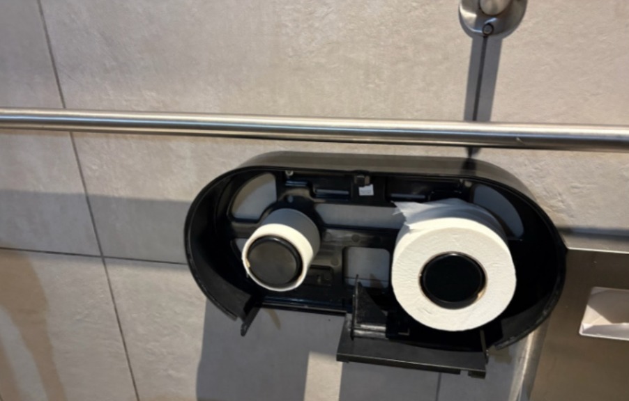 This job involved the replacement of an existing toilet paper dispenser with a new, double-roll unit, ensuring it was securely mounted and adhered to accessibility standards (due to the adjacent grab bars)