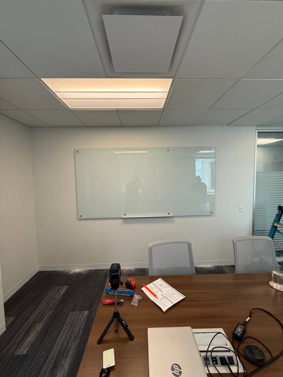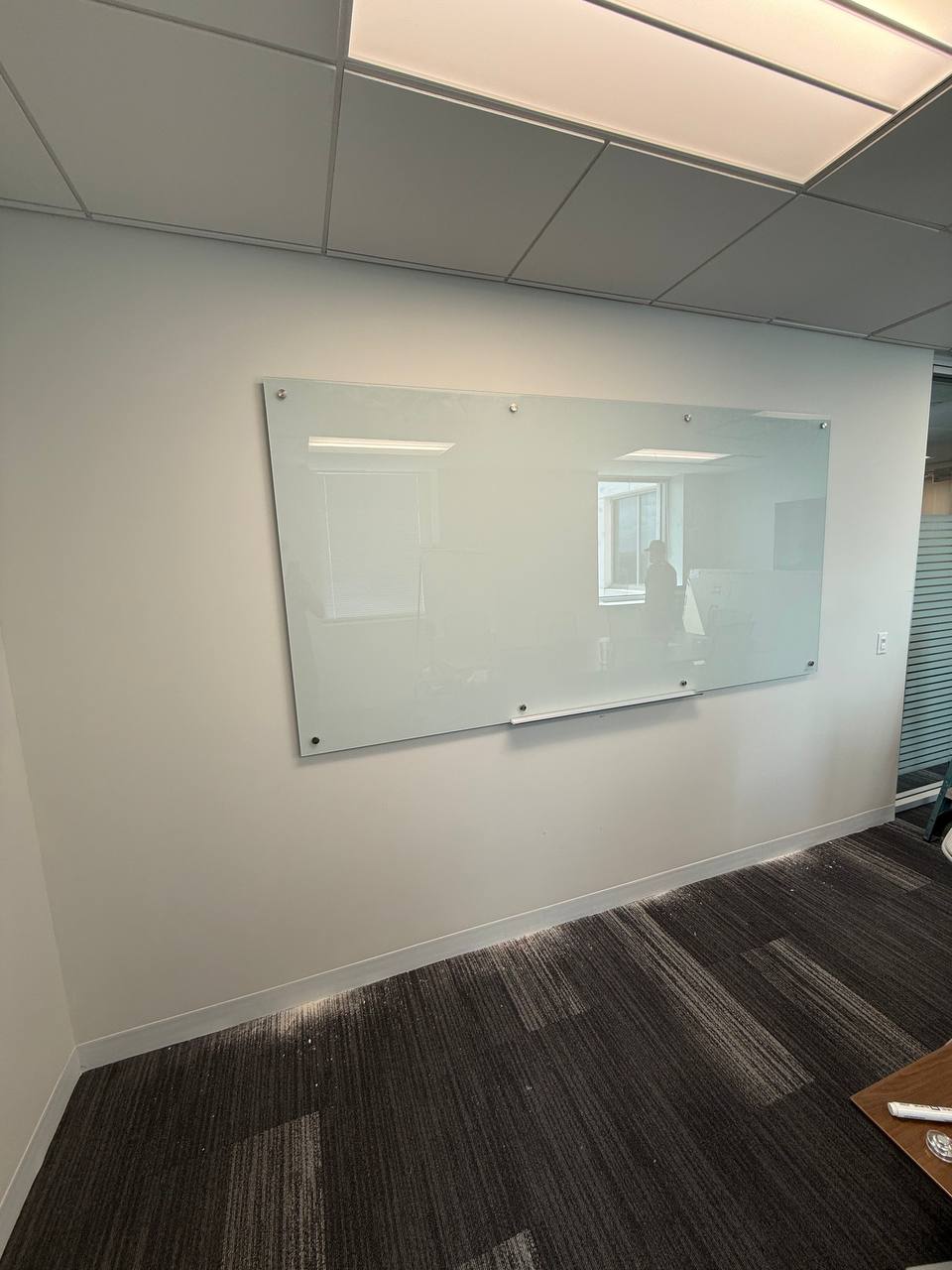 The wall surface was inspected and prepped to ensure it was clean and structurally sound to bear the weight of the whiteboard. The whiteboard was installed using heavy-duty mounting hardware and the installation was performed to ensure the board is perfectly level and plumb according to standard mounting height requirements.